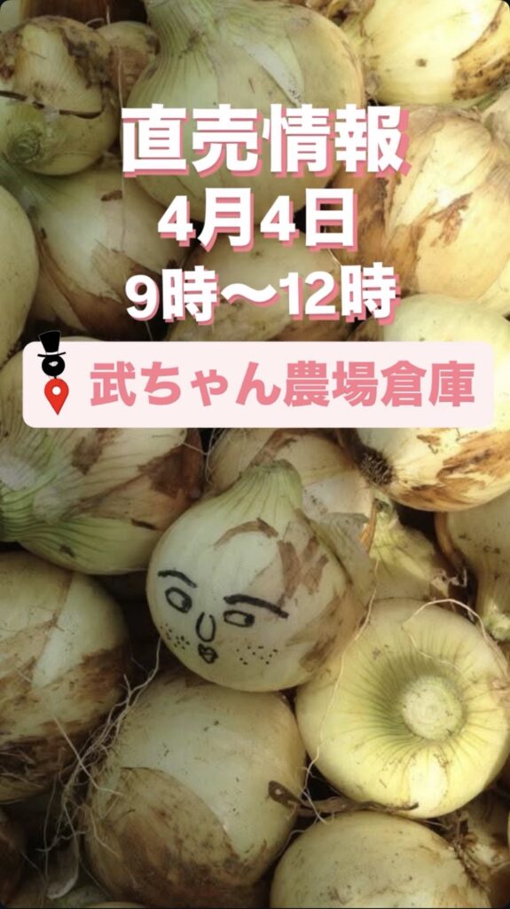 投稿日: 2026年4月4日2026年4月4日4月4日直売情報9:00〜武ちゃん農場倉庫です Screenshot 時間は9:00〜12:00です 武ちゃん農場以外、他では出していない “玉笑ちゃん”の直売になります! にんじんドレッシングもあります #残り少なくなってきました! よろしくお願いいたします✨